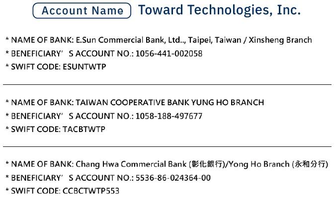 In line with our company name change, our existing remittance account numbers will remain the same, with only the account name updated to Toward Technologies, Inc.