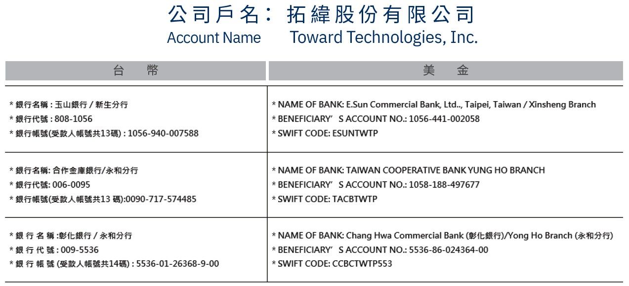 因應本公司更名作業,原有服務之匯款帳號將維持不變,僅戶名更新為「拓緯股份有限公司」。變更後銀行資訊如下。請依原付款方式匯款,並於 2025 年 6 月 10 日起更新為新戶名,以確保順利入帳。